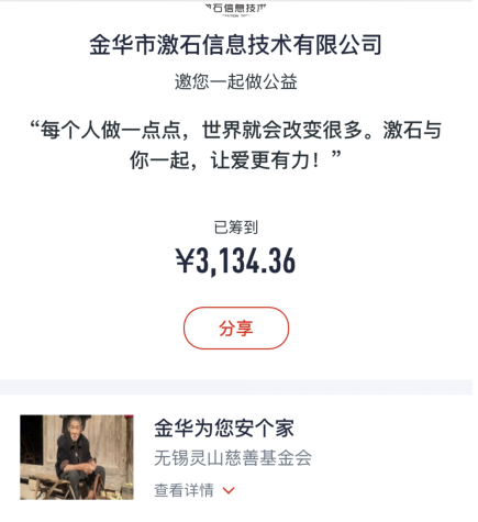 金華市愛(ài)一起公益協(xié)會(huì)在2016年4月份由11位發(fā)起人注冊(cè)登記,也是金華市2016年以來(lái)***家直接注冊(cè)登記的公益社會(huì)組織,協(xié)會(huì)一直致力于農(nóng)村孤寡老人的關(guān)愛(ài)項(xiàng)目,今年的9月9日騰訊公益日,金華愛(ài)一起協(xié)會(huì)再一次發(fā)起“金華為您安個(gè)家”項(xiàng)目的捐款,金華市激石信息技術(shù)有限公司,助力項(xiàng)目的捐款行動(dòng),***時(shí)間進(jìn)行項(xiàng)目的的號(hào)召與呼吁,螢火蟲(chóng)愛(ài)心社捐出3000元,有一些小伙伴另外又單獨(dú)進(jìn)行了愛(ài)心支持。